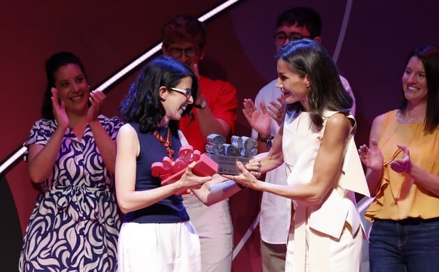 Koningin Letizia droeg gisteren een bijzondere gevlochten top. Ze was als voorzitter aanwezig bij de finale van de wedstrijd voor wetenschappelijke monologen “Sólo de Ciencia”. Het doel van deze wedstrijd is, om onderzoekers al vanaf het begin van hun professionele carrière te betrekken bij wetenschappelijke verspreiding.