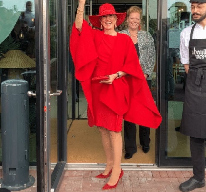 Hè lekker, Maxima in vlammend monochrome rood😍 Mooie details verwerkt in het jurkje.