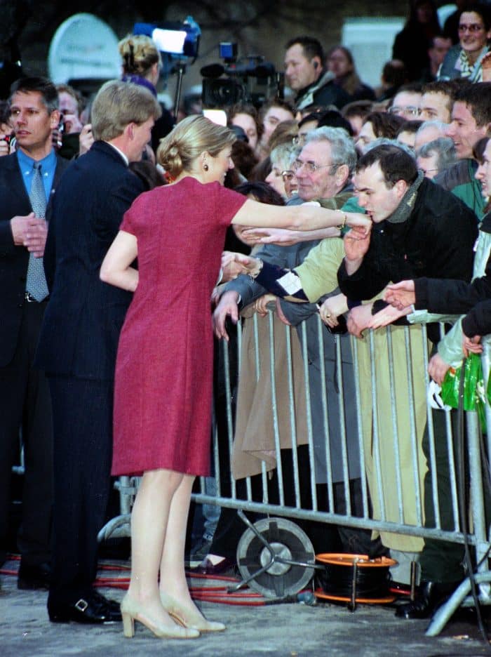 Eenmaal buiten, na de aankondiging van de verloving, werd het pas écht een feestelijke dag. Even geen persvragen meer, maar vooral veel publiek, dat Máxima dolenthousiast ontving. Máxima ging er gelijk in op, en schudde samen met haar prins vele handen!