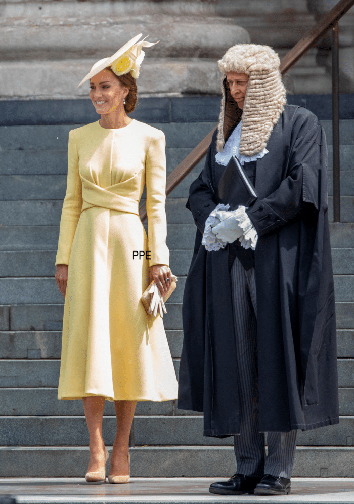Prinses Catherine hulde zich in Butter Yellow tijdens een feestelijk jubileum in de St. Paul. Hoewel ik eerst vol verbazing slash verwondering naar de meneer met pruik heb gekeken, viel mijn oog erna direct op de bijzondere knoop op de taille. Wat een mooi patroon schuilt hierachter! Ik twijfel alleen nog over de afwerking van de zoom, maar verder krijgt dit plaatje qua uitvoering een tien met een griffel.