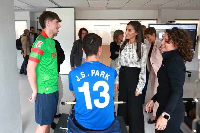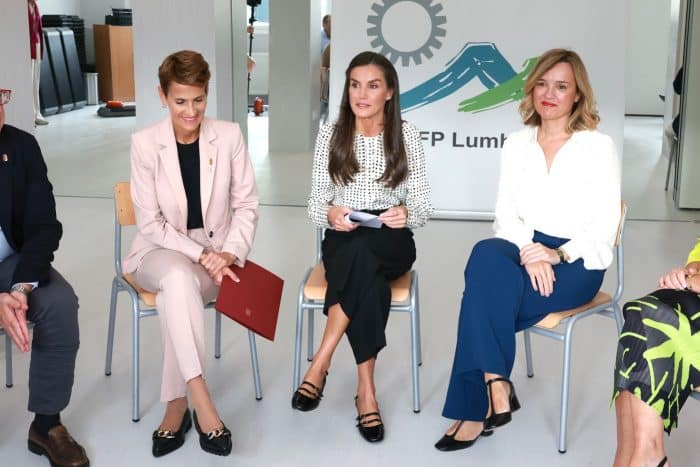 Koningin Letizia was deze week voorzitter van de openingsceremonie van de beroepsopleiding 2025/2026 aan het Lumbier IIP Integrated Polytechnic Vocational Training Centre in Navarra. De dag was gewijd aan innovatie, inzetbaarheid en sociale cohesie. Letizia droeg een gestipte blouse op een zwarte broek. Van beide outfits is het label: Hugo Boss.