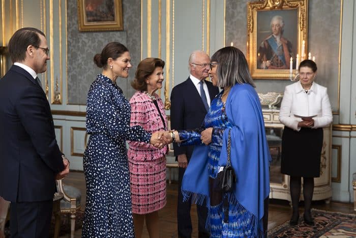 Op 2 oktober hielden de Koning en Koningin en het kroonprinsessenpaar een diplomatieke receptie voor buitenlandse gezanten in het Koninklijk Paleis. Koningin Silvia droeg een mantelpakje van Weill Paris. Kroonprinses Victoria droeg een rok met blouse in dezelfde print van Stock lm Studio.
