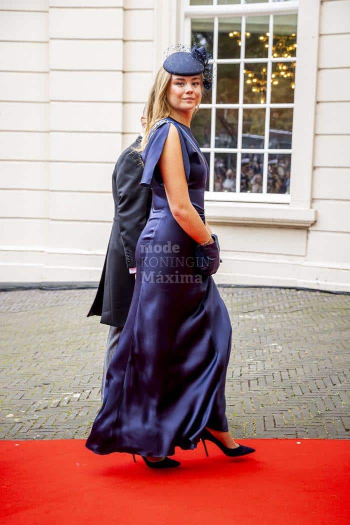Prinses Ariane draagt een nachtblauwe japon met korte mouwen met bijpassende hoed. Ontwerper: Victoria Beckham.
