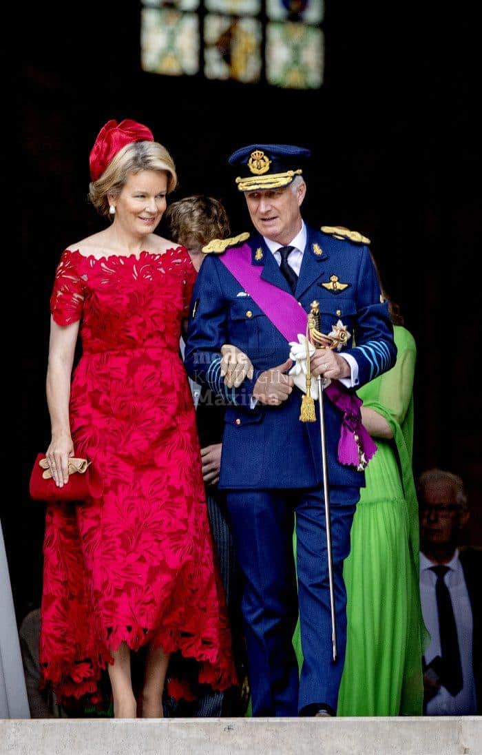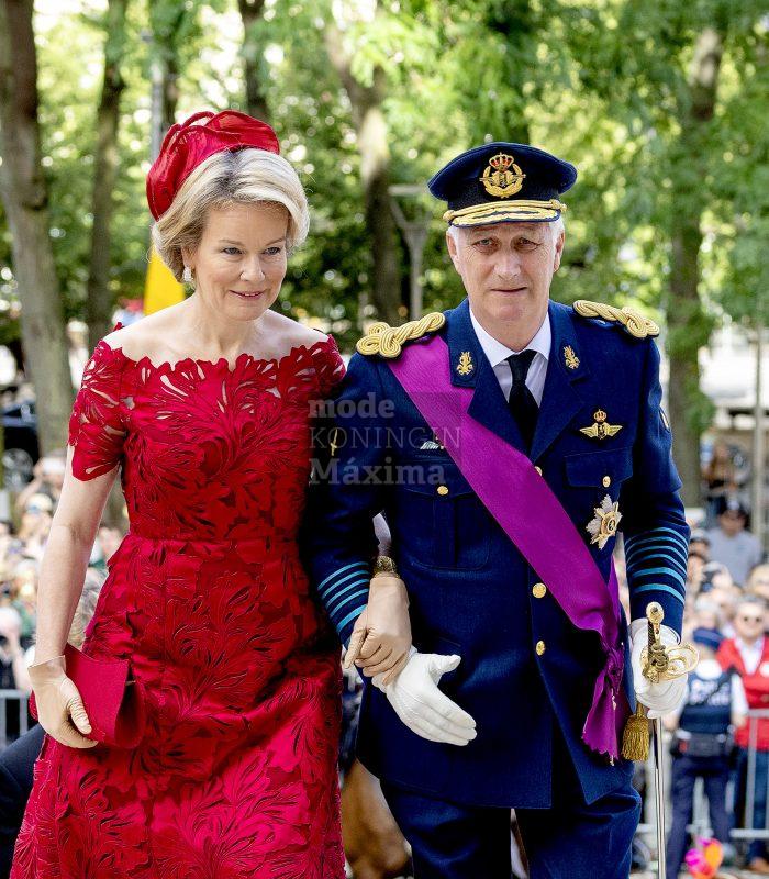 Koningin Mathilde gaat vandaag, op Nationale Feestdag, gekleed in een rode kanten japon van Modehuis Natan. Haar hoedje is een ontwerp van Fabienne Delvigne, die ook de rode clutch maakte.