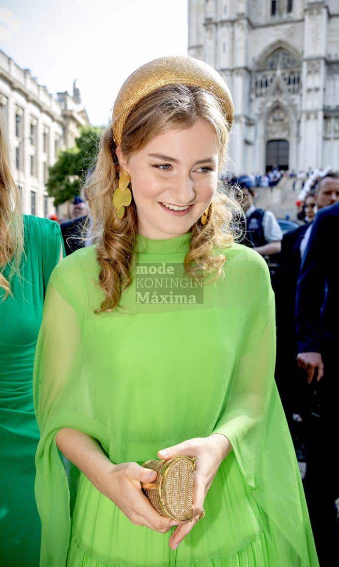Prinses Elisabeth kiest voor een appelgroene jurk van Natan Couture. Haar haarband is een ontwerp van Atelier Anne Stoffels.