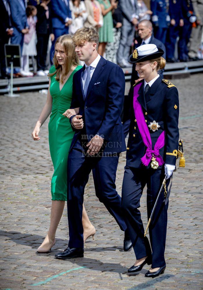Altijd leuk het Belgisch Koningshuis te zien. De koning en zijn gezin zoals we gewend zijn om door een ringetje te halen, beschaafd en veel klasse uitstralend. Zo leuk ook, hoe ze allemaal gearmd lopen. Mathilde mooi in de rode, kanten jurk. Een veilige keus, zeker, maar waarom niet? Elisabeth heerlijk zwierig in haar felgroene jurk, vooral op bewegend beeld een plaatje. Eléonore goed gekleed in deze sprekende tint groen, veel beter dan die wat oubollige printjes waar we haar af en toe in zagen. Claire kan zoveel beter, jammer. Delphine, ach, ik was verbaasder geweest als zij klassiek was gekleed. Als kunstenares en buitenbeentje van de familie past dit gewoon bij haar, bovendien geeft zij een Belgisch ontwerper een podium.
