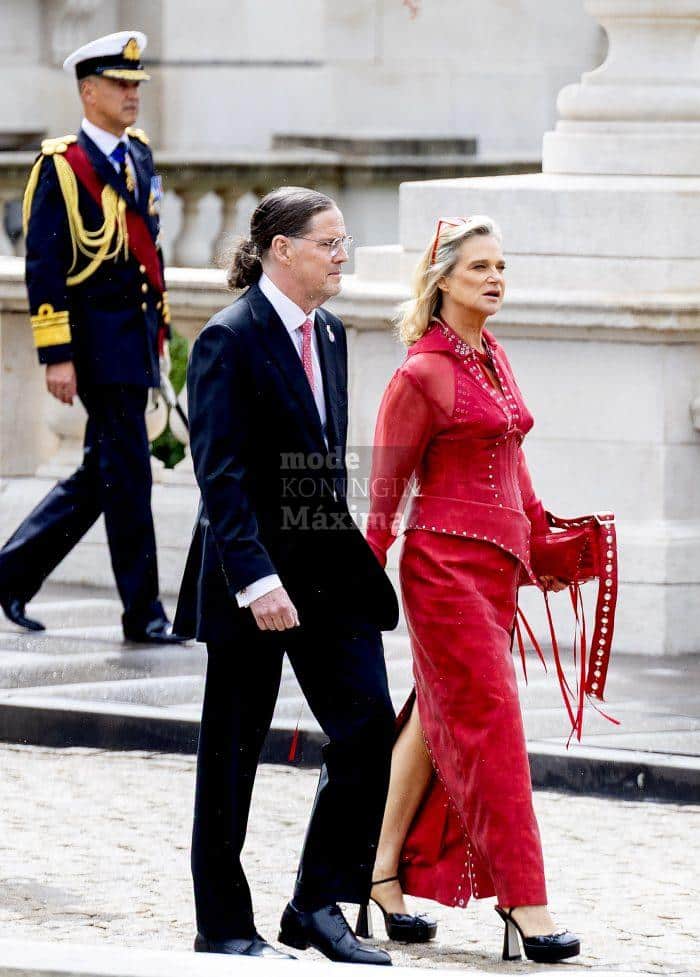 Prinses Delphine draagt een opvallende rode jurk met flinke split, van Judassime.