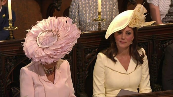 De mode-uitdaging zat hem in het hoofddeksel. Hoewel een mantilla, een kanten sluier, vaak de gepaste keuze is voor koninginnen, zocht Camilla de ‘gulden middenweg’ tussen haar persoonlijke voorkeur voor Treacy’s creaties en de Vaticaanse traditie. Ze koos voor een haardecoratie waaraan een sluier was bevestigd.