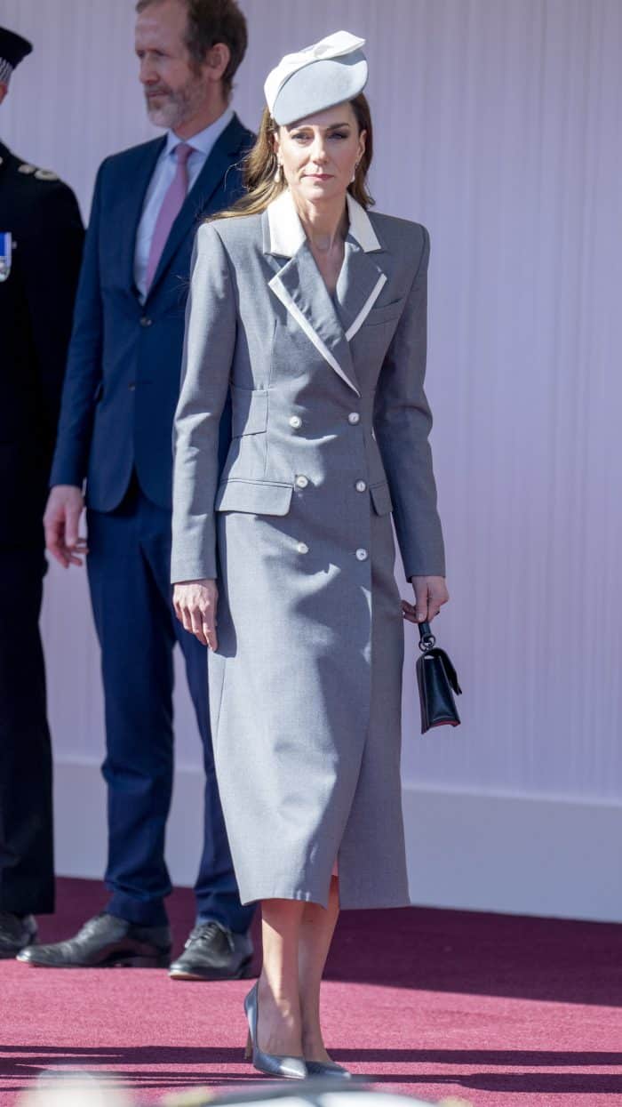 Catherine droeg tijdens het dagprogramma een mantel van de Brits-Nigeriaanse ontwerper Tolu Coker. Onder de mantel draagt ze een witte jurk. Qua accessoires draagt ze een grijs met witte hoed van de Britse milliner Jane Taylor. Ook haar pumps van Hugo Boss en Mulberry tas doen dienst.