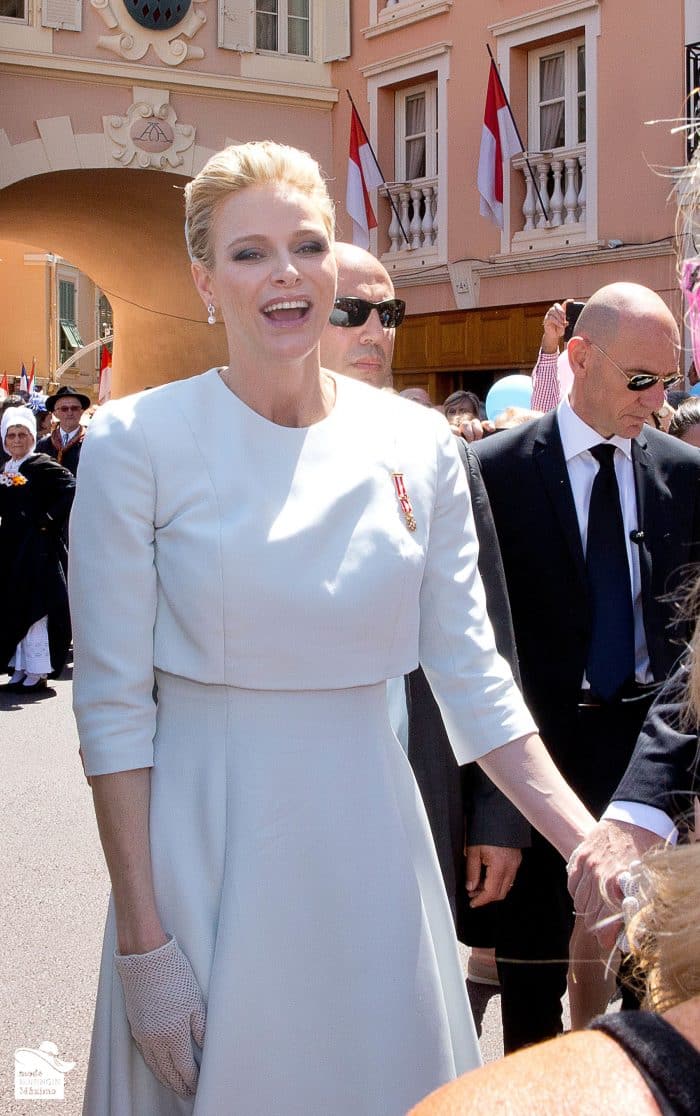 Dior heeft ook veel voor prinses Charlène ontworpen. De japon die ze droeg tijdens de doop van de tweeling is daar een mooi voorbeeld van. Let ook even op de gehaakte handschoenen, want die verwijzen natuurlijk naar Charlènes schoonmoeder in ruste: prinses Gracia. Overigens werden de doopjurken voor de tweeling ook ontworpen door (Baby) Dior.