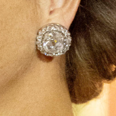 Inmiddels hebben we haar met verschillende varianten van de Stuart-oorhangers gezien. Het begon in Luxemburg met deze enorme diamanten stekers: