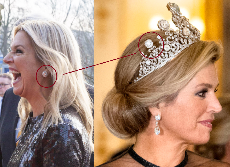 Op bovenstaande fotocollage is goed te zien dat de koningin bij beide gelegenheden andere oorbellen draagt en dat heeft een reden. De diamanten die Máxima links in haar oren draagt, staan op de foto rechts óp het diadeem. De diamanten van het Stuart-diadeem kan ze dus gebruiken als oorstekers of oorclips.