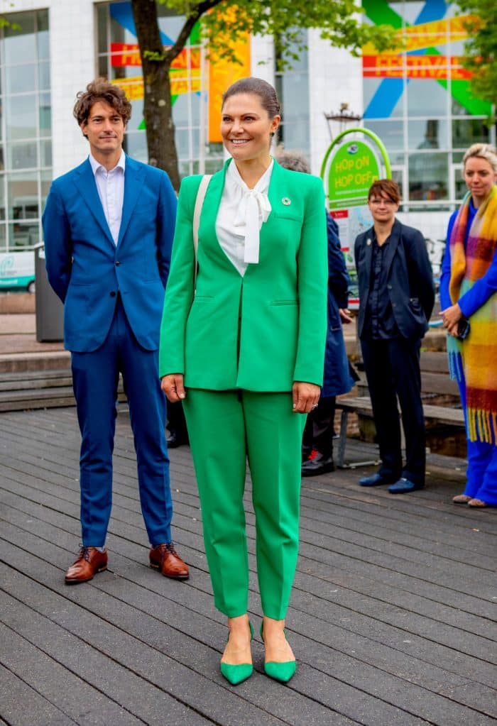 Victoria ziet er meestal stijlvol uit, tikkeltje ingetogen, maar toch heel modisch. Wat een prachtige foto met het loshangende haar, zo’n mooie compositie. Leuk dat er een bos fluitenkruid staat in de antieke jardiniere. Niks geen deftig boeket, lekker Zweeds, zo uit de natuur! Het groene broekpak vind ik niet zo, slechte pasvorm, de schoentjes zijn wel leuk. De blauwe avondjurk met plissé is echt een kunstwerk en past haar zo perfect.