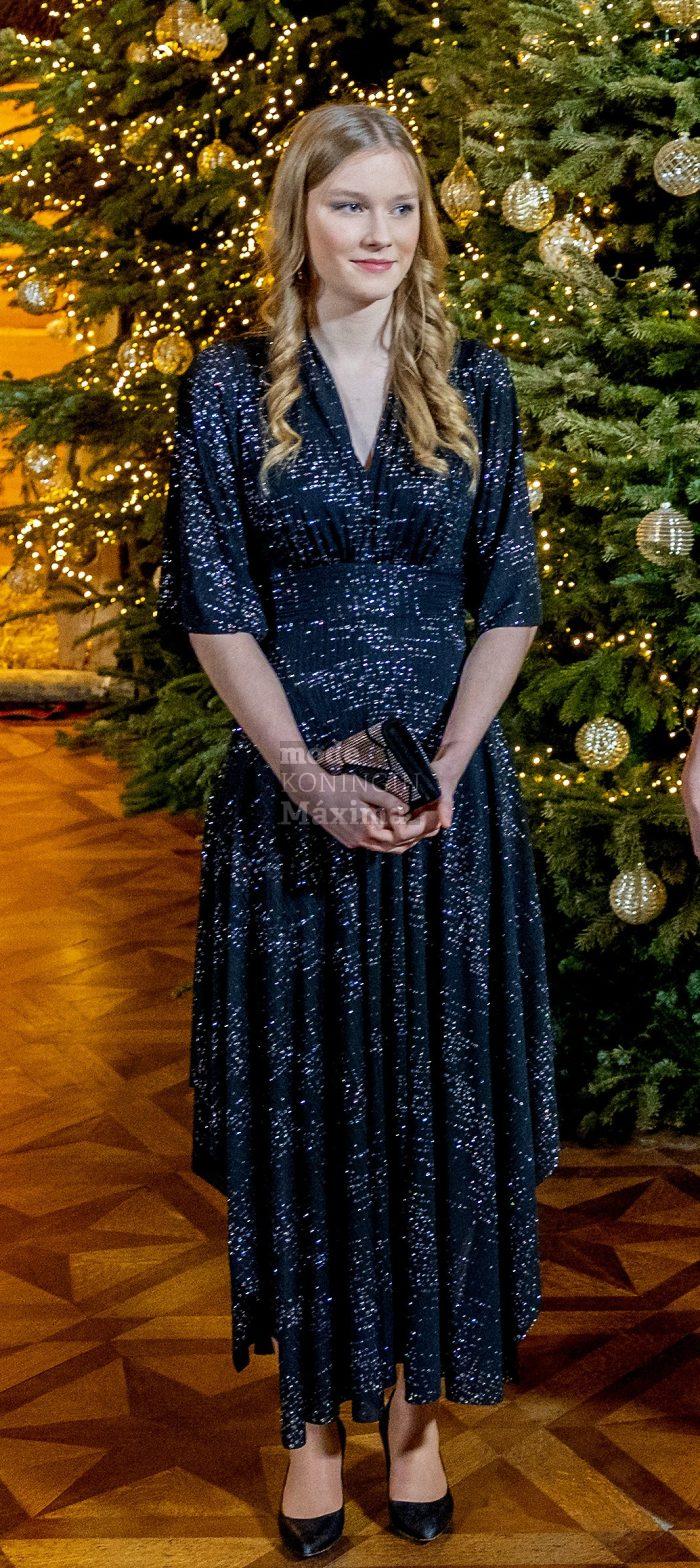 13. Prinses Eléonore heeft een donkerblauwe glitterjurk van Maje in haar kast hangen.