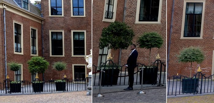 Wel werd er na de NAVO-top nog wat geschoven met de potten. Voorheen stonden er links en rechts van het bordes drie struiken op stam.(foto links) Eén wat hogere en twee wat lagere. Bij de NAVO-top stond één van de twee kleine struiken op het bordes, en stonden aan weerszijden van het bordes een grote en een kleine struik op stam (foto midden). Anno 2026 staat juist de grootste struik op het bordes. Je zou denken dat de twee kleinere struiken dan weer naast het bordes staan, maar dat is niet zo. Er staat tegenwoordig nog maar één kleinere struik op stam naast het bordes (foto rechts). De tuinmannen of -vrouwen hebben dus flink moeten sjouwen.