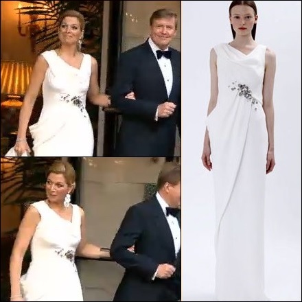 Op Paleis Noordeinde hebben koning Willem-Alexander en koningin Máxima vanavond gedineerd met de leden van het Nationaal Comité Inhuldiging. Voor de gelegenheid koos de koningin haar witte japon van J. Mendel, die we al eerder zagen tijdens de vijftigste verjaardag van Filip. Omdat er toen vrijwel geen beeldmateriaal is gemaakt begrijp ik het goed dat Máxima deze japon herdraagt. De watervalhals staat haar goed en ook de oorbellen en het losse haar vind ik erg geslaagd. Minpuntje vind ik de keuze voor sandalen onder deze japon. Tenen zijn nou eenmaal niet de mooiste lichaamsdelen, dus wat mij betreft mogen die netjes ingepakt worden in dichte pumps 😉