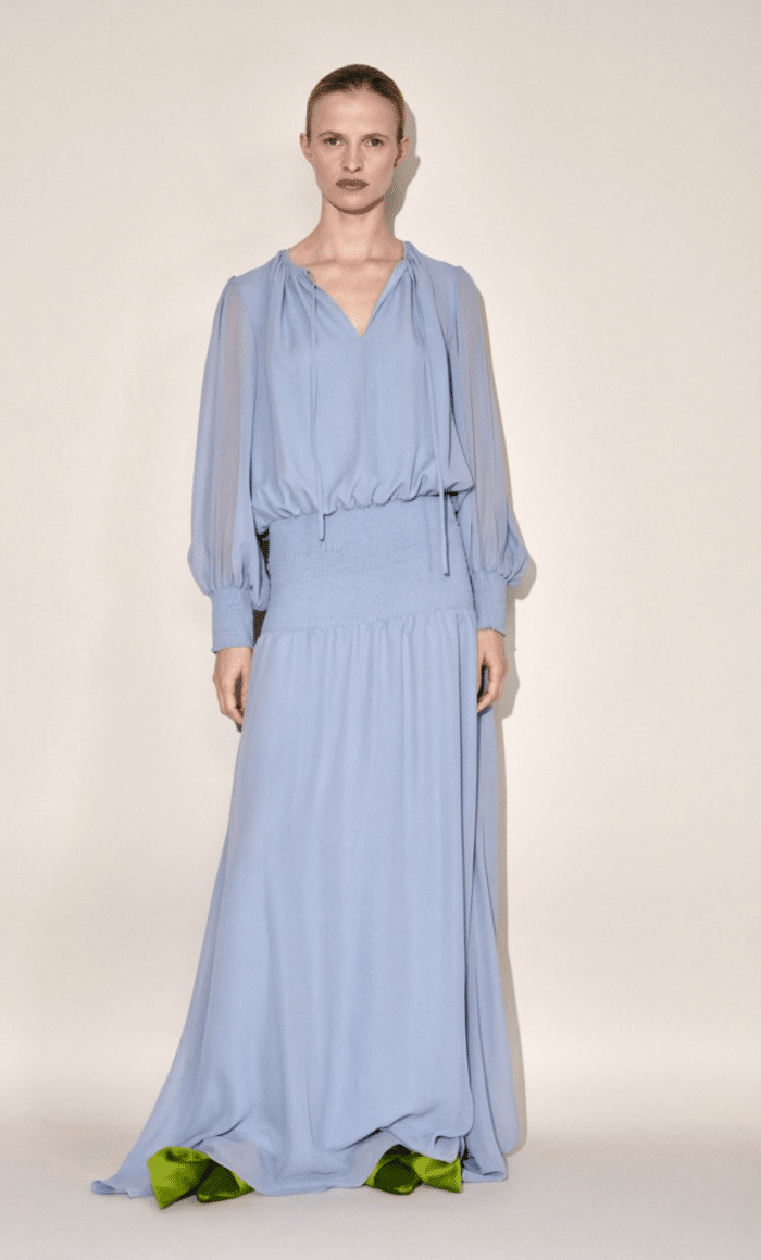 Koningin Máxima draagt een okergele jurk met een strikkraagje en smockwerk bij de taille. Een ontwerp van modehuis Natan.