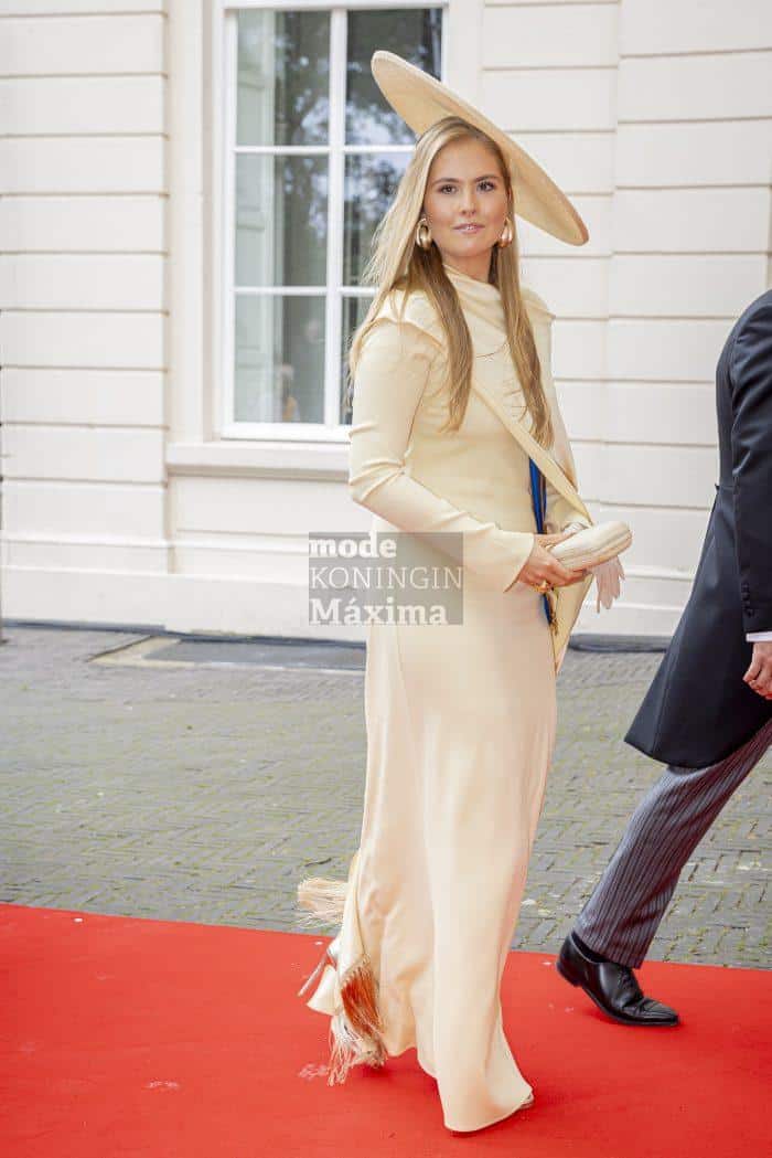 Prinses Amalia draagt een botergele asymmetrische jurk met gedrapeerde halslijn en asymmetrische mouwen. De maxi japon is een ontwerp van de Italiaanse ontwerper Taller Marmo. Amalia draagt een bijpassende botergele schotelhoed.