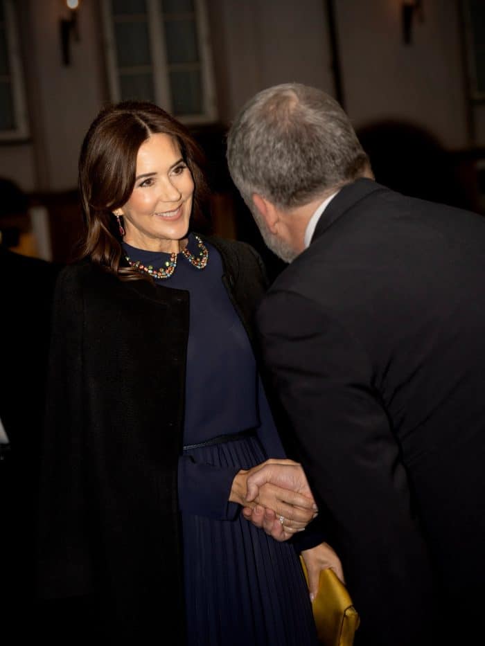 Koningin Mary bracht een bezoek aan de Stichting Psychiatrie. In ruim 30 jaar heeft Stichting Psychiatrie zich ingezet om het begrip en de omstandigheden van mensen die met een psychische aandoening leven te verbeteren. Mary is sinds 2005 beschermvrouw van de Stichting Psychiatrie. Woensdagavond was ze aanwezig bij de jubileumviering. Hierbij droeg ze een donkerblauwe jurk met een kraag die is afgezet met kraaltjes (label: Red Valentino). Met haar okergele accessoires (pumps van Manolo Blahnik) maakte ze het totaalplaatje wat feestelijker.
