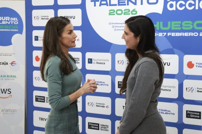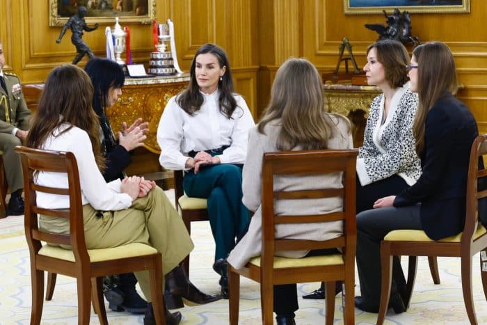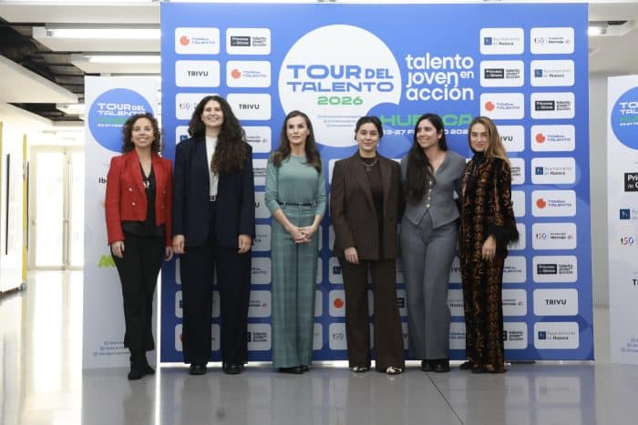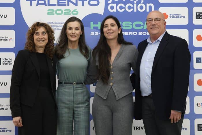 Donderdag was koningin Letizia voorzitter tijdens de proclamatieceremonie van de “Creaempresa 2026”-prijs van de Prinses van Girona. Voorafgaand aan de ceremonie bezocht ze de tentoonstelling van de Young Painters Award van de Ibercaja Foundation. Deze tentoonstelling is onderdeel van de tweede etappe van de Talententour van de Stichting Prinses van Girona. Hierbij ging Letizia gekleed in een zeegroene trui van Falceroni op een geruite broek van Mirto. Letizia’s zeegroene handtas is afkomstig van Hugo Boss.