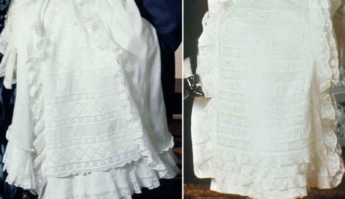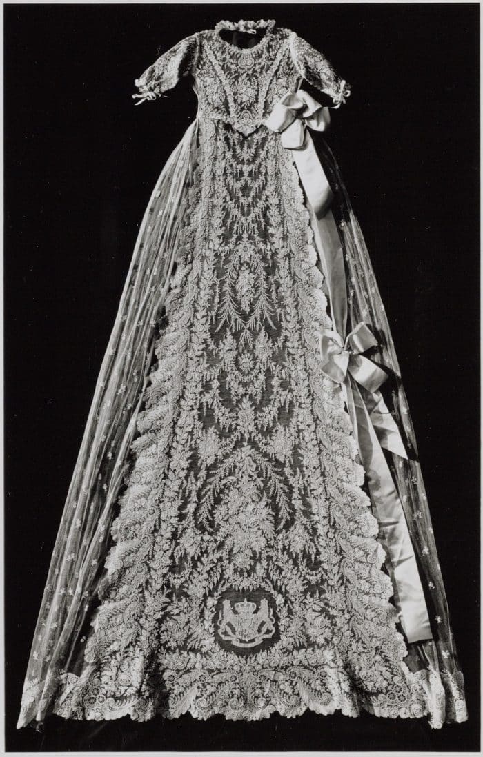 Laten we beginnen met de meest bekende. In het jaar 1880 liet koningin Emma voor haar dochter Wilhelmina een doopjurk van delicaat, Brussels kant maken. Mevrouw Anne Maria Schelfhout-Picnot, dochter van de hoftandarts, verwerkte het kant met zorg en aandacht tot een doopjurk met toebehoren. “Prachtiger werk en rijker aan kunstsmaak kan men zich op het gebied van kant- en borduurwerk moeijelijk iets denken” is het commentaar in de krant. Na Wilhelmina worden ook Juliana, Beatrix, Christina, Willem-Alexander en zijn drie dochters in deze kwetsbare jurk ten doop gehouden.
