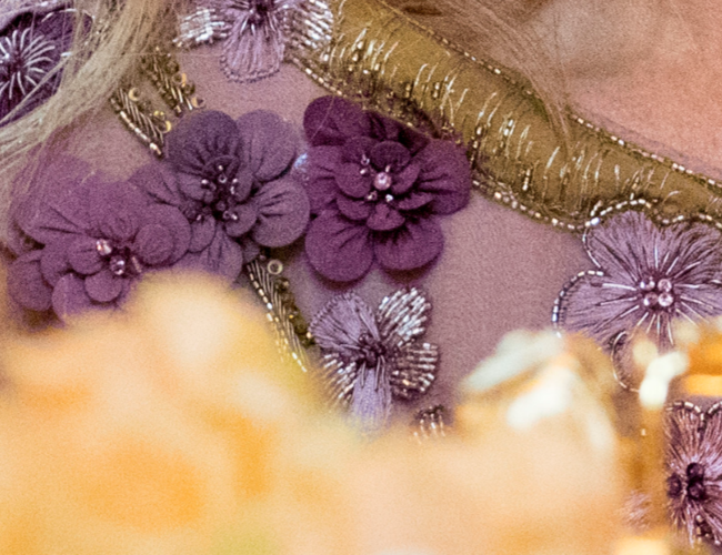 Koningin Máxima draagt een zijde organza japon voorzien van delicaat borduurwerk van violetkleurige bloemen, goudgroene bladeren en bamboe. Er zijn vele 2-d en 3-d technieken gebruikt, zoals handschilderen, gouddraad bewerkingen, broderie d'art, appliqueren, en het met stof bekleden van pailletten.