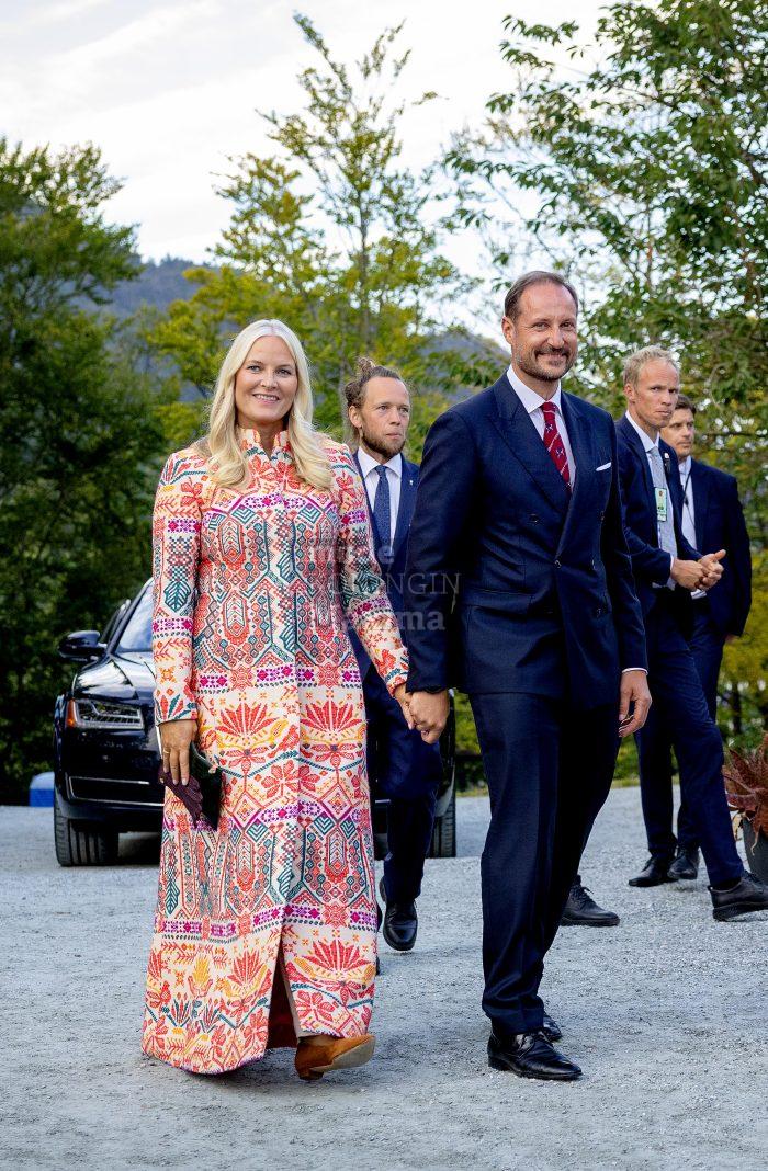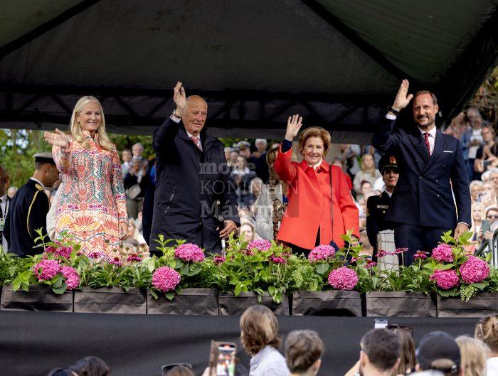 Later voegde ook koning Harald zich bij hen. Mette-Marit liet twee bijzonder fleurige outfits zien, terwijl koningin Sonja twee keer voor een fleurig effen jasje koos.