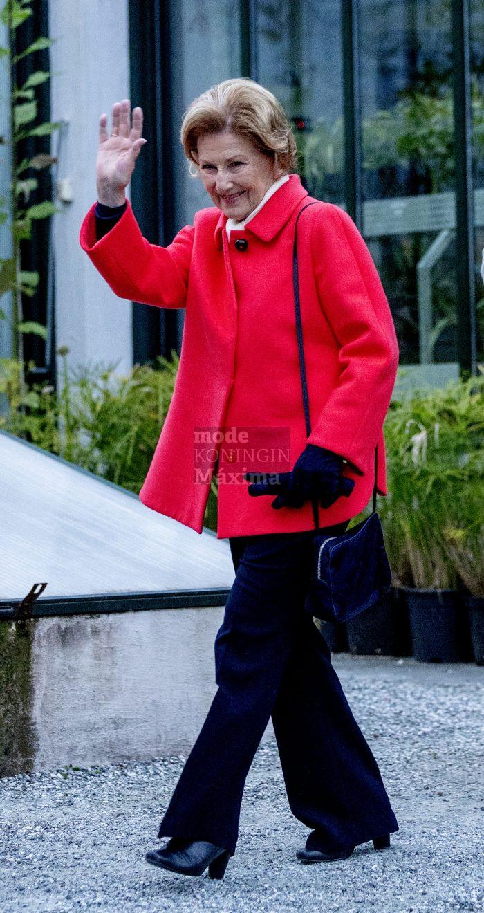 Koningin Sonja ziet er heel leuk en fris uit in dat rode jasje, wat mooi afsteekt tegen de zwarte broek.