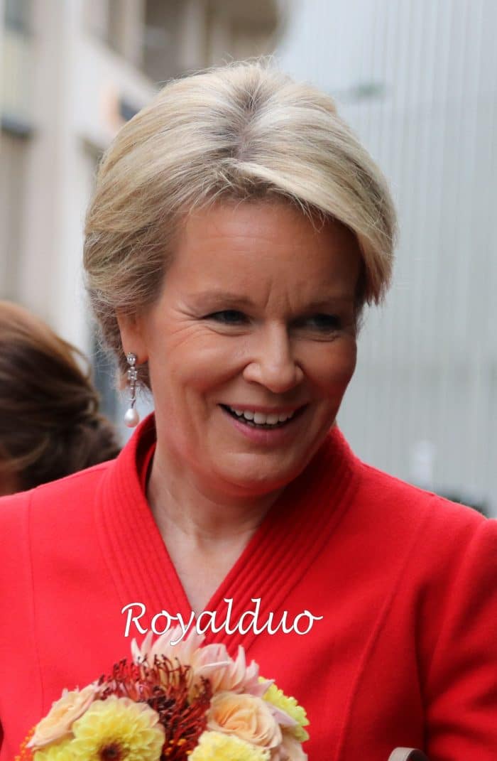 Koningin Mathilde koos er voor om compleet in het nieuw te gaan. Althans, haar jurk en mantel. Waar haar nieuwe rode jurk, met v-hals en een rij knoopjes aan de voorkant van het lijfje, vandaan komt, weten we niet. Ook de ontwerper van de mantel is onbekend. Haar beige handtas komt van Dior.