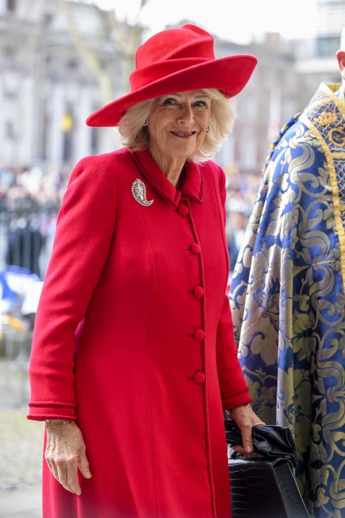 Koningin Camilla gaat voor een andere kleur uit de Britse vlag, zij kiest vandaag van top tot teen voor felrood. De koningin draagt een rode crêpe wollen mantel van ontwerpster Fiona Clare. Daarbij draagt ze een rode hoed, die afkomstig is van Phillip Treacy. De broche met palmbladeren is ooit van de Queen Mum geweest.