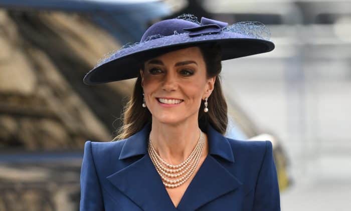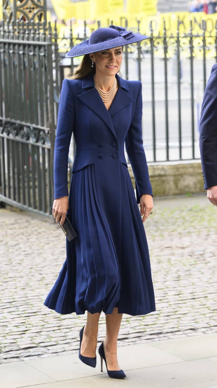 Catherine ziet er stijlvol uit in een elegante marineblauwe jasjurk van één van haar favoriete ontwerpers, Catherine Walker. De jasjurk heeft schoudervullingen, dubbele knopen en een plissé rokgedeelte. Het lijkt er op dat Catherine dezelfde hoed draagt als in 2023 tijdens Commonwealth Day, zij het met een lichte aanpassing. Er is nu voile op de rand van de marineblauwe hoed bevestigd.