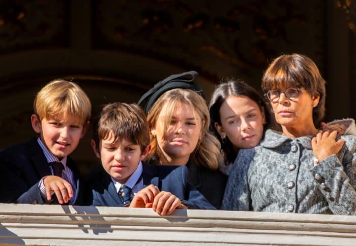 Prinses Stephanie zien we hier in een grijs gemeleerde mantel. Ze staat hier met v.l.n.r. Sacha Casiraghi, de oudste zoon van Andrea Casiraghi, Raphael Elmaleh, de oudste zoon van Charlotte Casiraghi en met haar dochters Camille en Pauline.