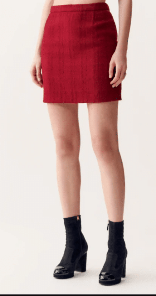 Charlotte draagt eveneens een deux pieces van Chanel, maar dan in rood. Haar zwarte pumps en zwarte riem zijn eveneens afkomstig van Chanel.