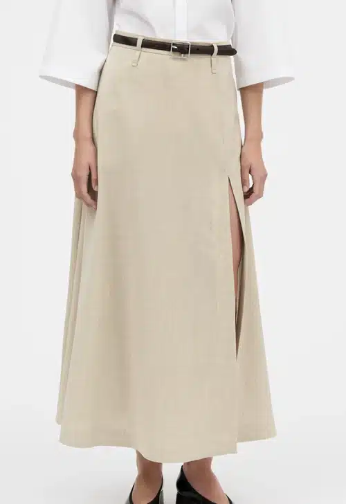 De start van het bezoek is anders dan bijvoorbeeld tijdens een staatsbezoek aan Zweden of Noorwegen. De welkomstceremonie ziet er heel anders uit. Dat maakt ook dat de kleding van koning Frederik en koningin Mary minder formeel is tijdens deze start. Later volgt er ongetwijfeld nog een meer officiële welkomstceremonie. Koningin Mary koos voor een zandkleurige maxi rok (label: Mark Kenly Domino Tan) met een blouse met een patroon van paraplu’s. Zandkleurige maxi rokken met splitten opzij zijn helemaal een trend voor het voorjaar en de zomer van 2026.