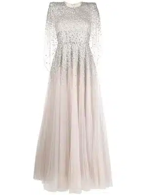 Prinses Madeleine draagt een zilvergrijze galajapon, vol glitter en glamour. Ook Madeleines japon is niet nieuw. Zij droeg de japon, net als koningin Silvia, eerder in 2023 tijdens het 50-jarig regeringsjubileum van de Zweedse koning. De japon is destijds ontworpen door Jenny Packham. Op haar hoofd prijkt dit keer wel een andere tiara: de aquamarijnen kokoshnik tiara.