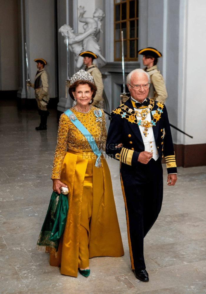 Koningin Silvia draagt een mosterdgele/goudkleurige galajapon met kleurrijke steentjes, die op het lijfje zijn geborduurd. De japon is niet nieuw, we zagen de japon eerder tijdens het 50-jarig regeringsjubileum van koning Carl Gustaf in 2023. Ontwerp: Georg et Arend. Tiara: Negentand tiara.