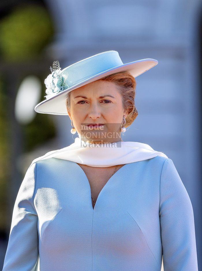 Groothertogin Stéphanie ging gekleed in een lichtblauwe midi jurk met omgeslagen witte manchetten. Buiten draagt ze er een witte sjaal bij. Hoewel mijn eigen gedachten eerst naar Modehuis Natan gingen, wordt elders op internet over Safiyaa gesproken als mogelijke ontwerper. Dan zou het vermoedelijk een op maat gemaakte jurk zijn. De halslijn is wel regelmatig te zien in de huidige collectie van Safiyaa. Op de foto hieronder zie je hoe mooi Stéphanie alles op elkaar heeft afgestemd. Hoed, jurk, schoenen en tas passen perfect bij elkaar.