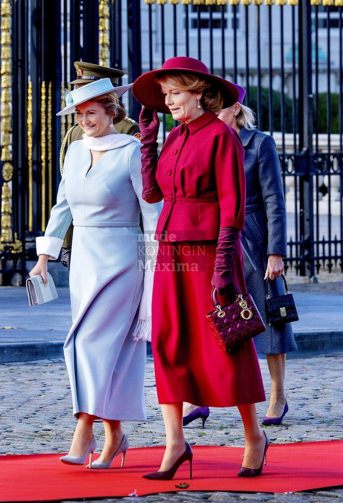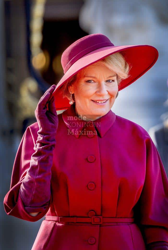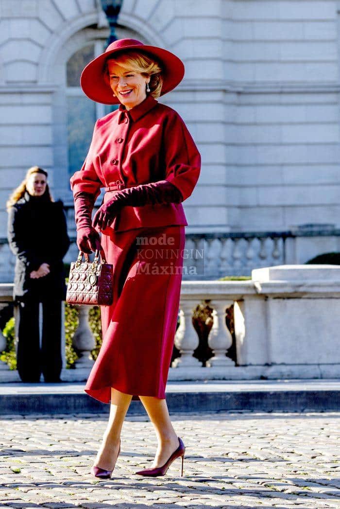 Koningin Mathilde droeg gisteren haar warmrode ensemble van Christian Dior. Daarnaast is ook de bordeauxrode tas afkomstig van Dior, evenals de pumps. Mathilde maakt haar outfit compleet met lange bordeauxrode handschoenen.