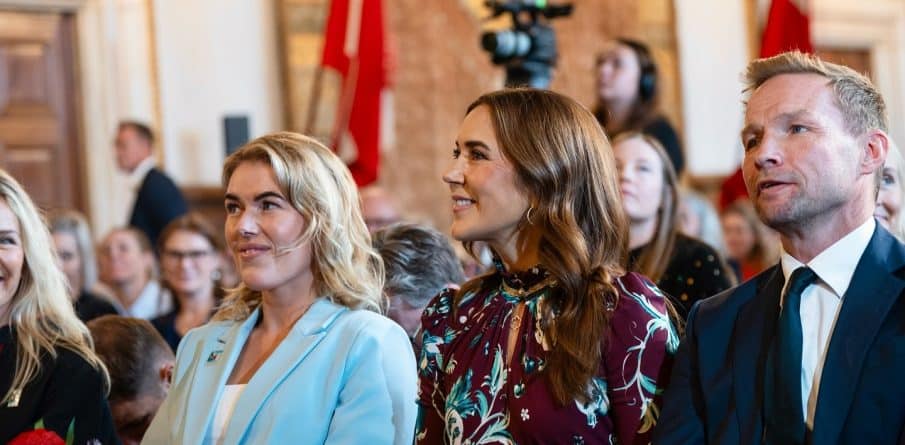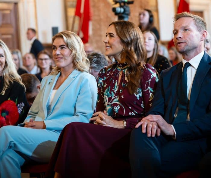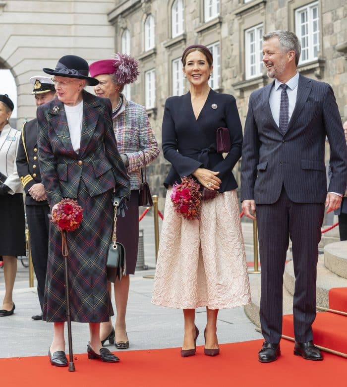 Tot slot waren koning Frederik en koningin Mary, samen met koningin Margrethe en prinses Benedikte, aanwezig bij de opening van het parlement. Daar zagen we Mary in een crèmekleurige jacquard midi rok (label: Lunatica Milano), met een donkerblauw jasje (label: Scanlan Theodore). Daarbij koos Mary voor wijnrode accenten: pumps van Gianvito Rossi en een hoedje met open achterkant van Jane Taylor.