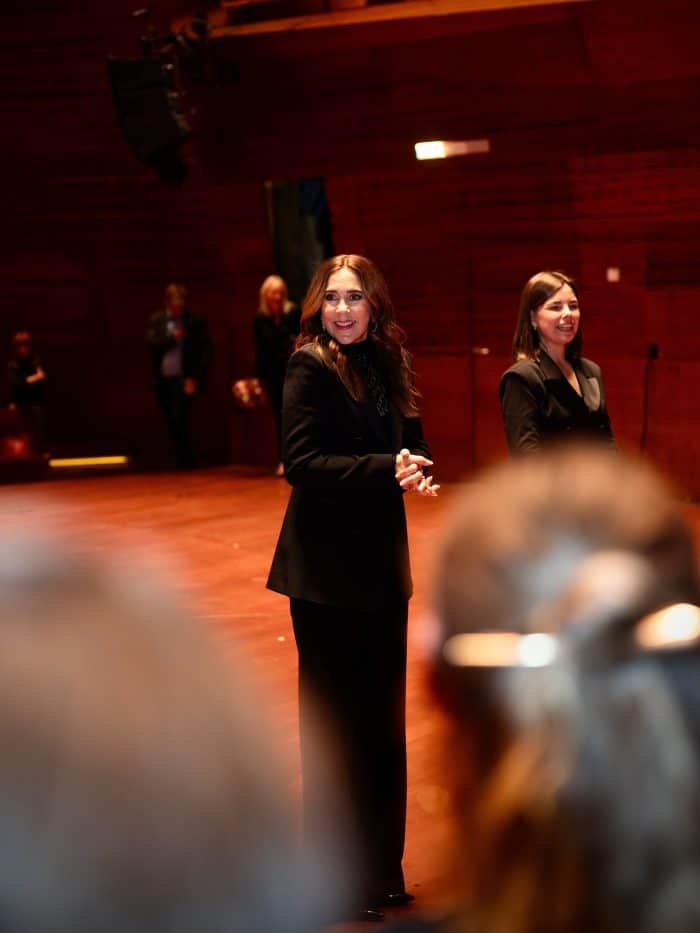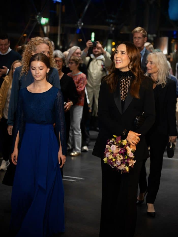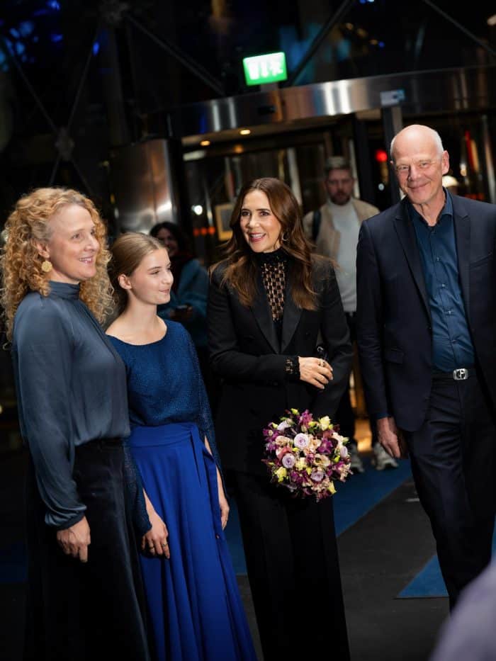 Ook was koningin Mary deze week aanwezig bij het concert “DR Girl Choir in the Dark”. Een volledig verduisterde concertzaal in het DR Concertgebouw, zorgde er voor dat het publiek op een nieuwe manier naar muziek luisterde. Mary paste haar kleding aan aan de gelegenheid, en koos voor een zwarte outfit. Een zwart broekpak van Paul Smith met haar Rohé top.