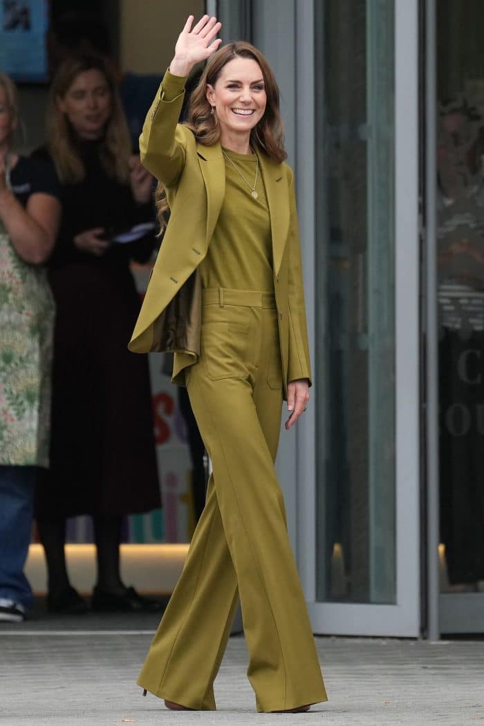 Catherine, de prinses van Wales, bracht afgelopen donderdag een bezoek aan Home Start Oxford. Daarbij ging ze van top tot teen gekleed in olijfgroen. Een broekpak (label: Victoria Beckham) met bijpassende top en pumps in dezelfde kleur (label: Ralph Lauren).