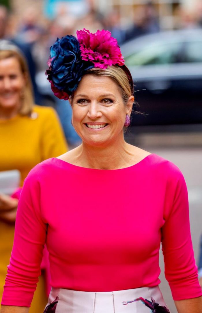 Bij informele werkbezoeken wil ze heus nog weleens kiezen voor herhaling of gemak, maar het kan niemand zijn ontgaan dat Máxima er veel plezier in heeft om qua mode te blijven verrassen. De ene dag betreedt ze de rode loper als een kleurrijke hippie, de andere dag als een moderne Jackie Kennedy en ook de krachtige businesslook behoort inmiddels tot haar repertoire. Voor de variatie laat de koningin zich inspireren door vriendinnen, modebladen en de vele foto’s op Pinterest. Ook collega’s brengen haar nog weleens op een idee, en dan met name hertogin Catherine. Toen het Britse stijlicoon in 2011 de zandkleurige pumps van LK Bennett omarmde als favoriet, trad Máxima al snel in haar voetsporen. De schotelhoed, de kleine druppelvormige hoed en de pumps van Gianvito Rossi zijn andere bekende voorbeelden. En ja, aan dit rijtje kan nu ook de XXL-haarband worden toegevoegd.