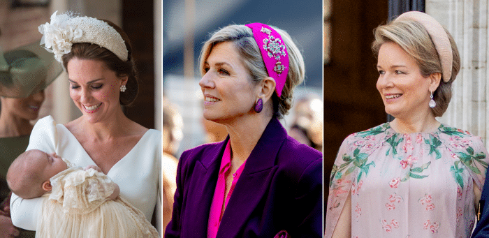 Catherine introduceerde hem tijdens de doop van prins Louis in juli 2018 (links). Bij de eerste foto’s was het even zoeken naar wat ze nu precies op haar hoofd had. Een hoed? Een haarband? Iets daar tussenin? Doordat het ontwerp was gemaakt van echte hoedenmaterialen, werd de accessoire al snel omgedoopt tot hatband (hoedenband). En nu, heel wat XXL-haarbanden verder, is Kate volgens de Britten zelfs de koningin van de hatband geworden. Of ze dat ook blijft is maar de vraag, want Mathilde, Máxima, Letizia en Mary zijn inmiddels geduchte concurrenten.