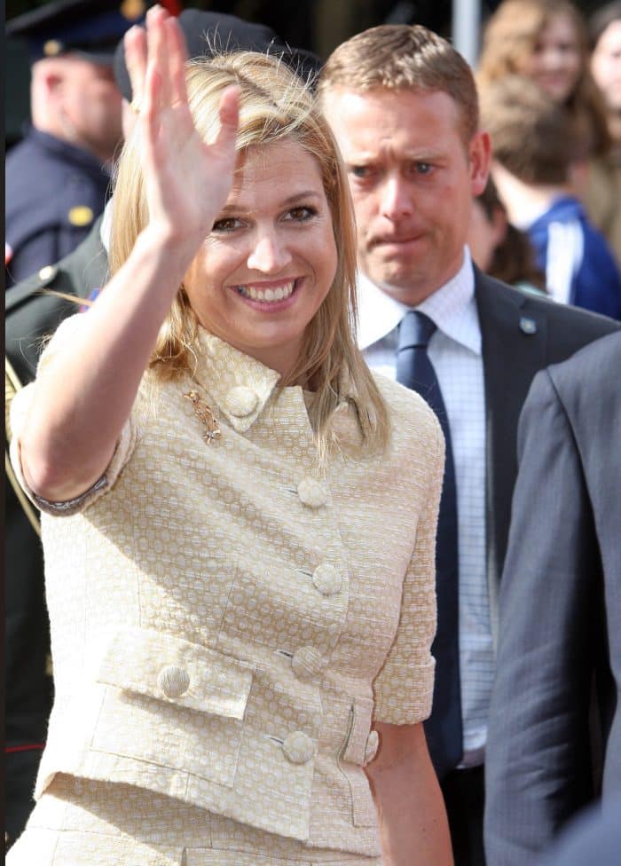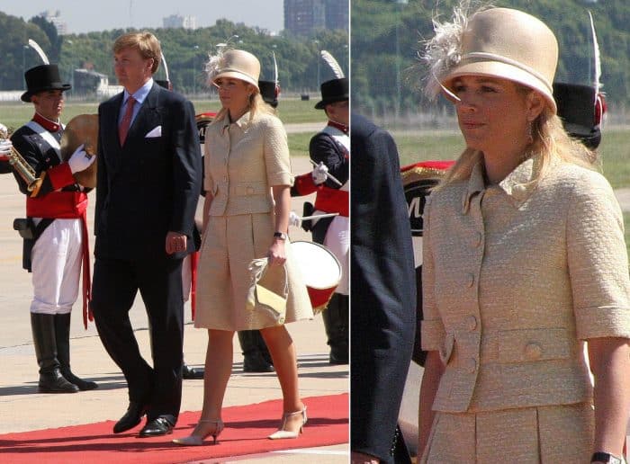 In de eerste jaren van het nieuwe millenium liet modeontwerper Edouard Vermeulen van Natan zich volop inspireren door de kleding van Jackie Kennedy. Lees: korte jasjes, monochrome ensembles en grote knopen. Het setje dat Máxima droeg bij de afsluiting van het staatsbezoek aan Argentinië is daar een goed voorbeeld van. Het jasje is voorzien van tien grote, beklede knopen. Twee op de mouw, twee op de kraag, twee op de zakjes en vier middenvoor. De stof met een werkje is ook gebruikt voor de rok met kenmerkende Natan-plooien.