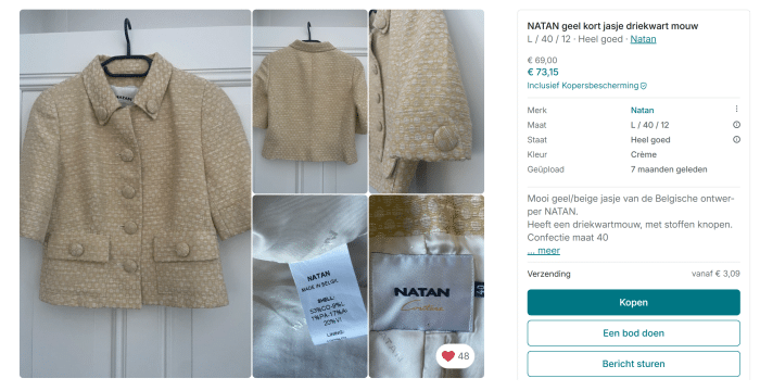 In 2006 bevestigde Natan gelijk dat het een set van het Belgische modehuis was. Niet dat we daaraan hoefden te twijfelen door de plooien, maar dat terzijde. Helaas ontbraken beelden van de catwalk, want die werden destijds nog niet via hun website gedeeld. Maar nu, twintig jaar later, volgt dan eindelijk de visuele bevestiging. Op Vinted kwam ik exact hetzelfde jasje namelijk tegen! Voor €73,15 is hij voor jou.