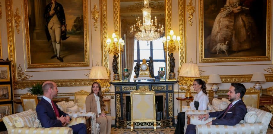 Kroonprins Hussein en zijn vrouw prinses Rajwa van Jordanië, brengen momenteel een bezoek aan Groot-Brittannië. Woensdag brachten ze onder andere een bezoek aan William en Catherine, de prins en prinses van Wales.