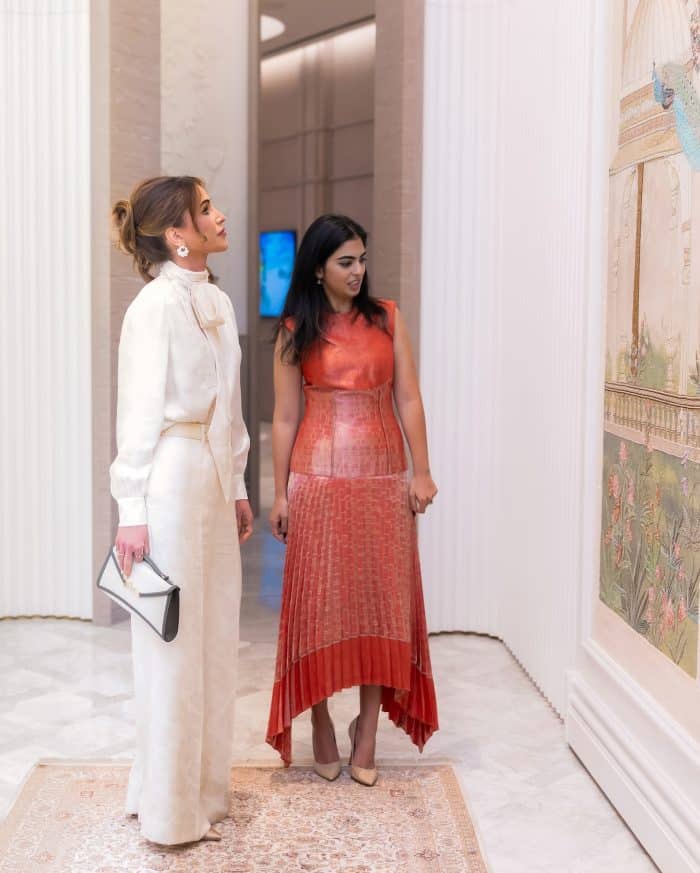 Later bezocht ze met hen ook het Nita Mukesh Ambani Cultural Centre (NMACC), waar een rondetafelgesprek gevoerd werd over vrouwelijk leiderschap in Mumbai. Rania droeg een ecru blouse met bloemenpatroon op een broek in dezelfde kleur en met hetzelfde patroon. Daarnaast heeft de blouse een strikkraag.