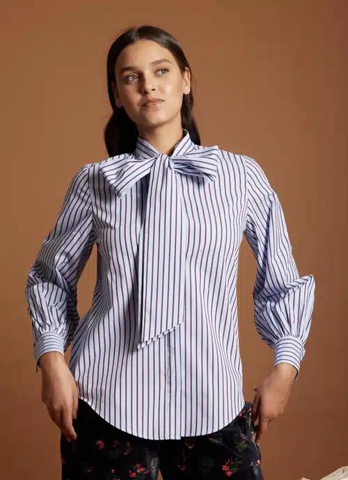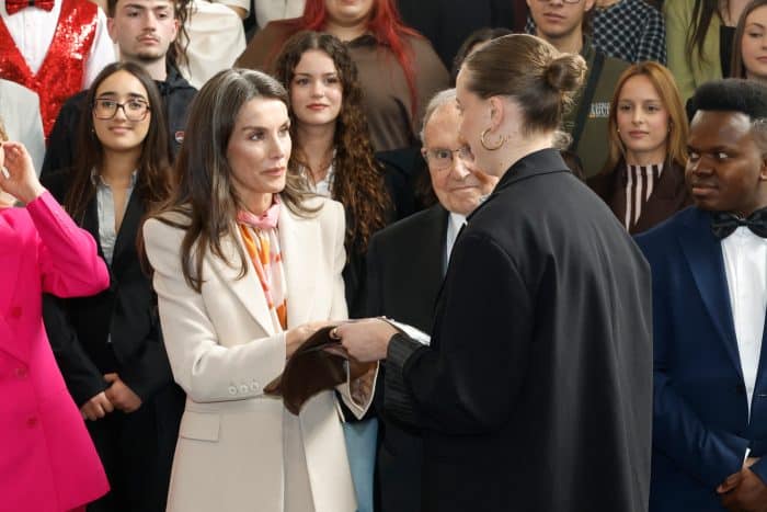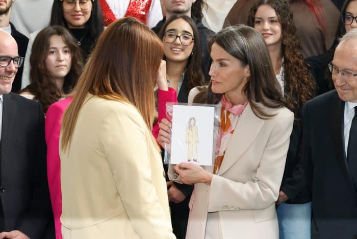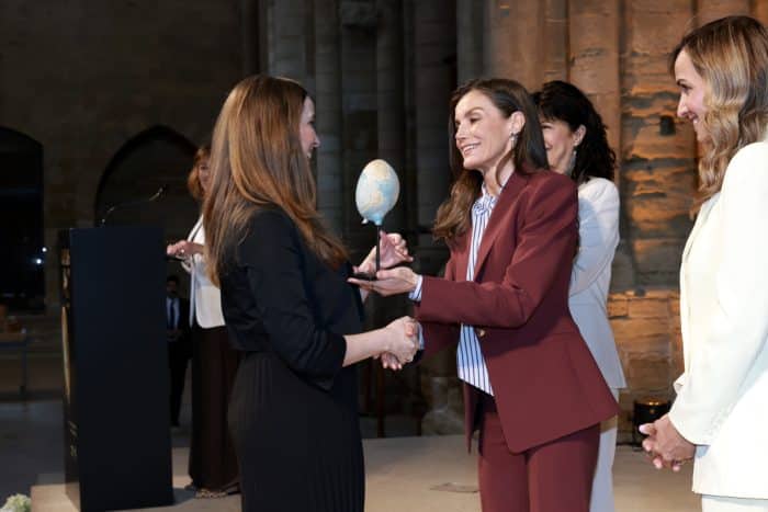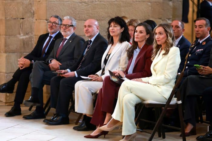 Koningin Letizia zat donderdag de werkvergadering voor met de “Associació de Dones Empresàries de Lleida” en de daaropvolgende uitreiking van de XVI “Ap!Lleida”-prijzen. Hiermee worden zakenvrouwen, leidinggevenden of professionals in de culturele, kunst-, sport-, communicatie- en ondernemerswereld erkend. Aan de stijl van Letizia valt iets anders te zien. Want hoewel de Spaanse koningin twee keer in een broekpak te zien was, droeg ze er beide keren een elegante (strik)blouse in kleur onder. Dat maakt het totaalplaatje verfijnder en vrouwelijker. Onder haar wijnrode broekpak van Hugo Boss, draagt Letizia een gestreepte strikblouse van Coosy.