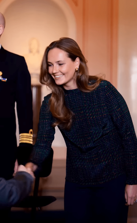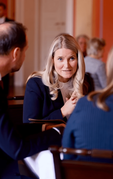Tijdens een deel van de ontmoeting had kroonprinses Mette-Marit haar zuurstofapparatuur in. Qua kleding zagen we de Noorse kroonprinses in een olijfgroene wijdvallende broek van het Australische label Zimmermann, met daarop een donkerblauw jasje van Bella Freud.