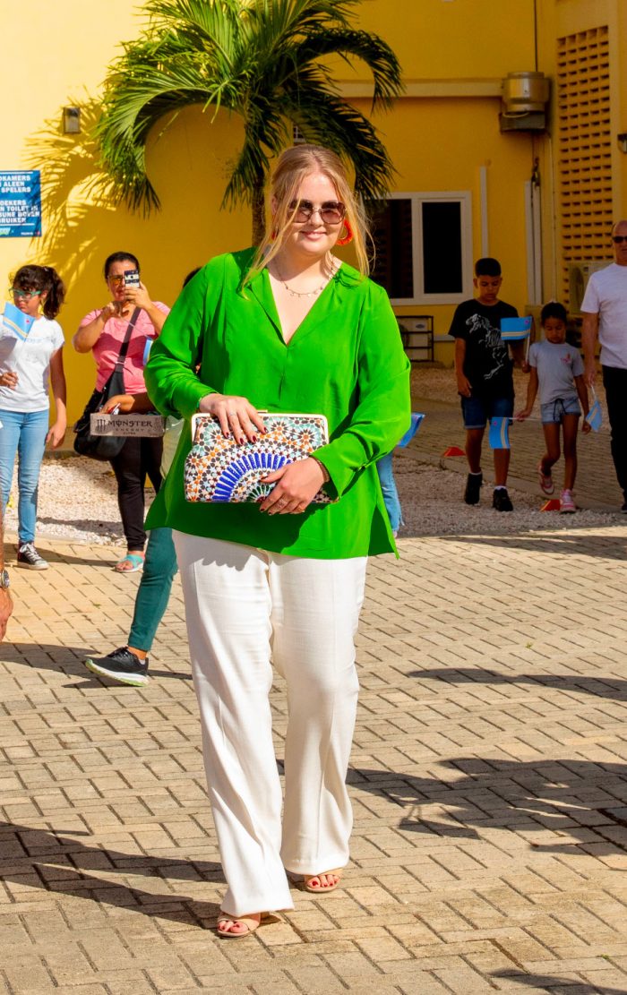 09-02-23 persmoment: Tijdens het persmoment, ter afsluiting van de tour, draagt Amalia opnieuw haar broekpak van MaxMara. Nu echter met de groene blouse, die we eerder op Aruba zagen.